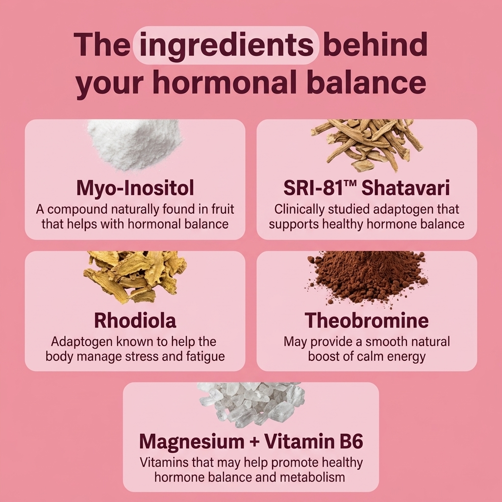 Myo-Inositol restores your cells' ability to respond to insulin properly — the exact mechanism behind why your weight, your skin, and your cycle are all connected. SRI-81™ Shatavari and Rhodiola calm the cortisol response that keeps your hormones in chaos. Theobromine and B6 stabilise your mood and energy without the crash. Magnesium pulls it all together at the nervous system level. Every ingredient has one job. Together they have one outcome.