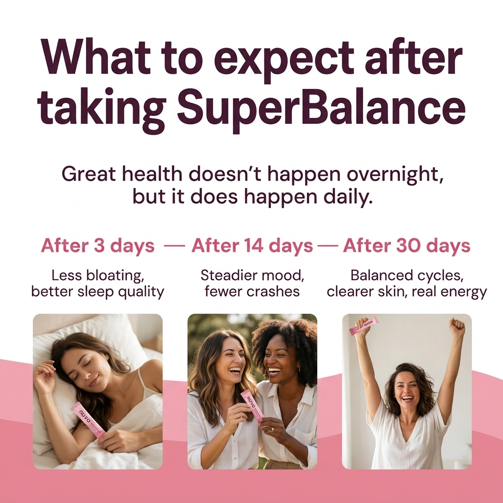 Most women notice something within the first 7 to 14 days. Usually it starts with sleep quality and energy levels stabilising. Mood changes typically follow in week two. Cycle and skin improvements are most noticeable between weeks three and six with consistent daily use. Hormonal balance is not an overnight fix but it is also not a year-long wait. Give your body 30 days and it will show you what it is capable of.